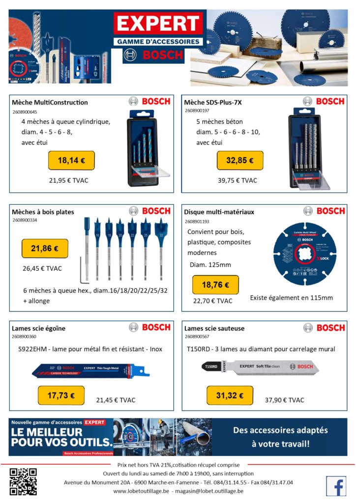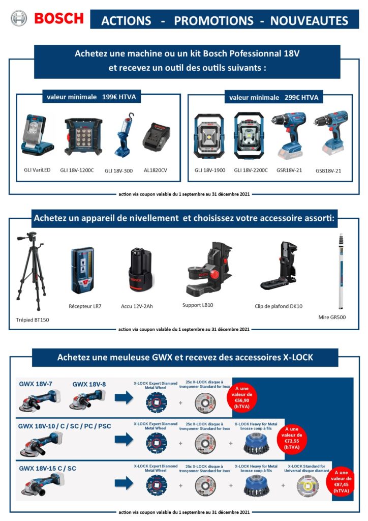 - Garantie Bosch “bleu”: 1 an prolongé à 3 ans sur les outils professionnels et à 2 ans sur les accus et chargeurs à l’inscription sur le site internet de Bosch.