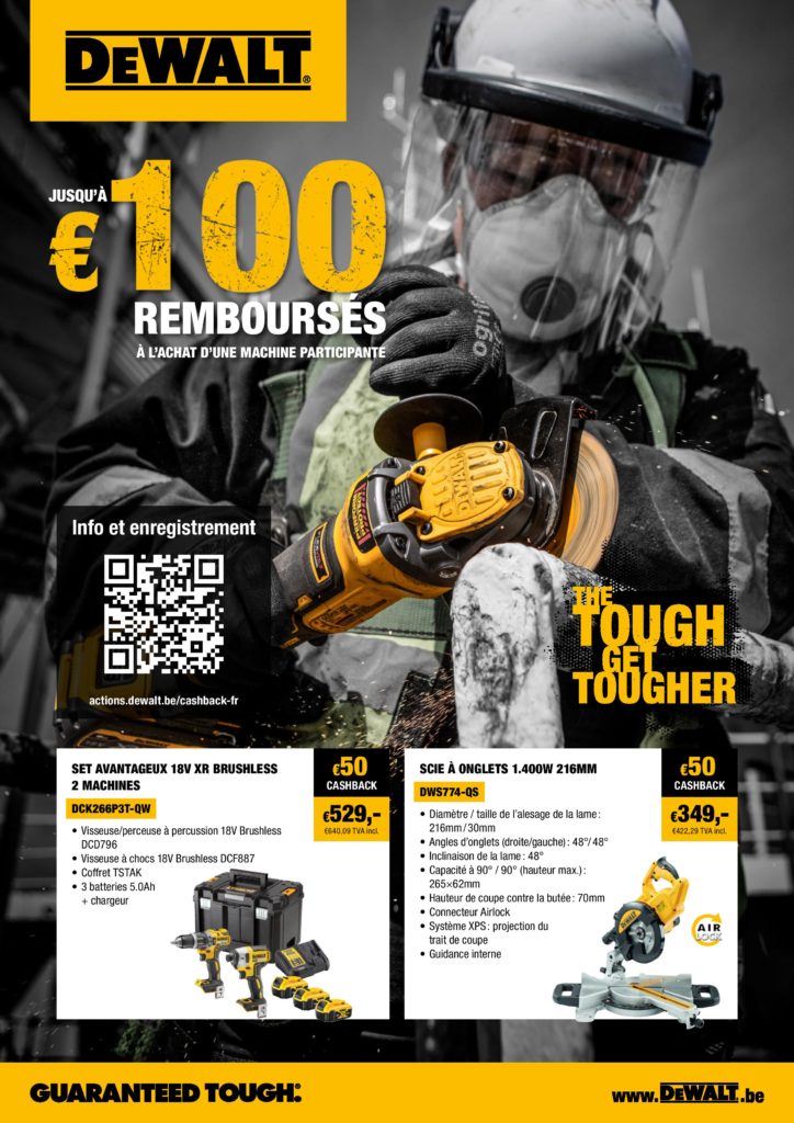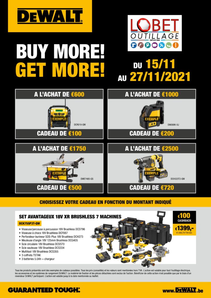 - Garantie De Walt: 1 an prologé à 3 ans sur les outils professionnels (sauf les cloueurs, accus et chargeurs), à l’inscription de votre machine sur le site internet de DeWalt.